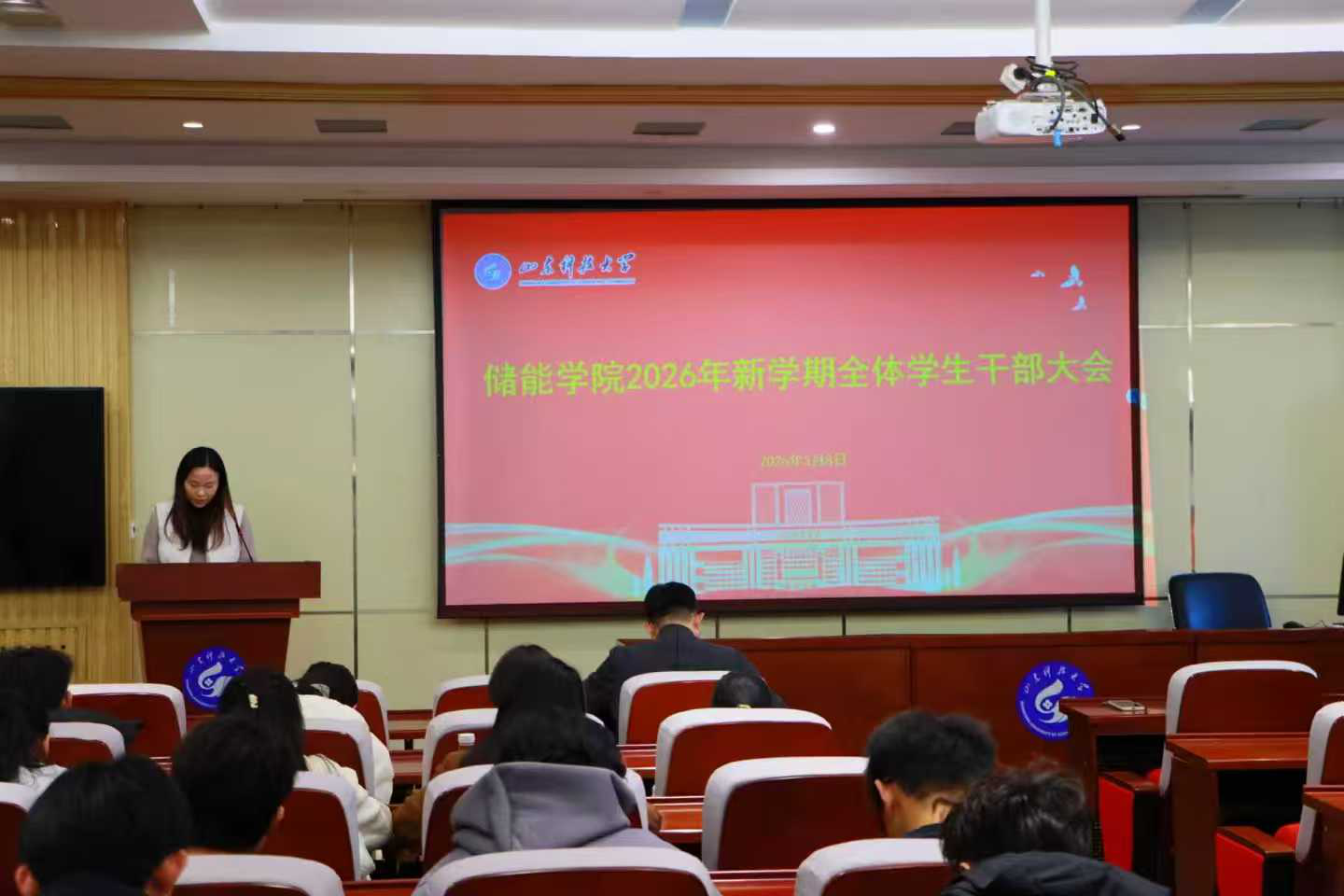 为进一步明确新学期学生工作思路,强化学生干部责任担当,凝聚奋进力量,3月9日,储能学院召开2026年新学期学生干部大会。学院党委书记田启发出席会议,全体辅导员及学生干部80余人参加大会,党委副书记兼副院长汪国庆主持会议。